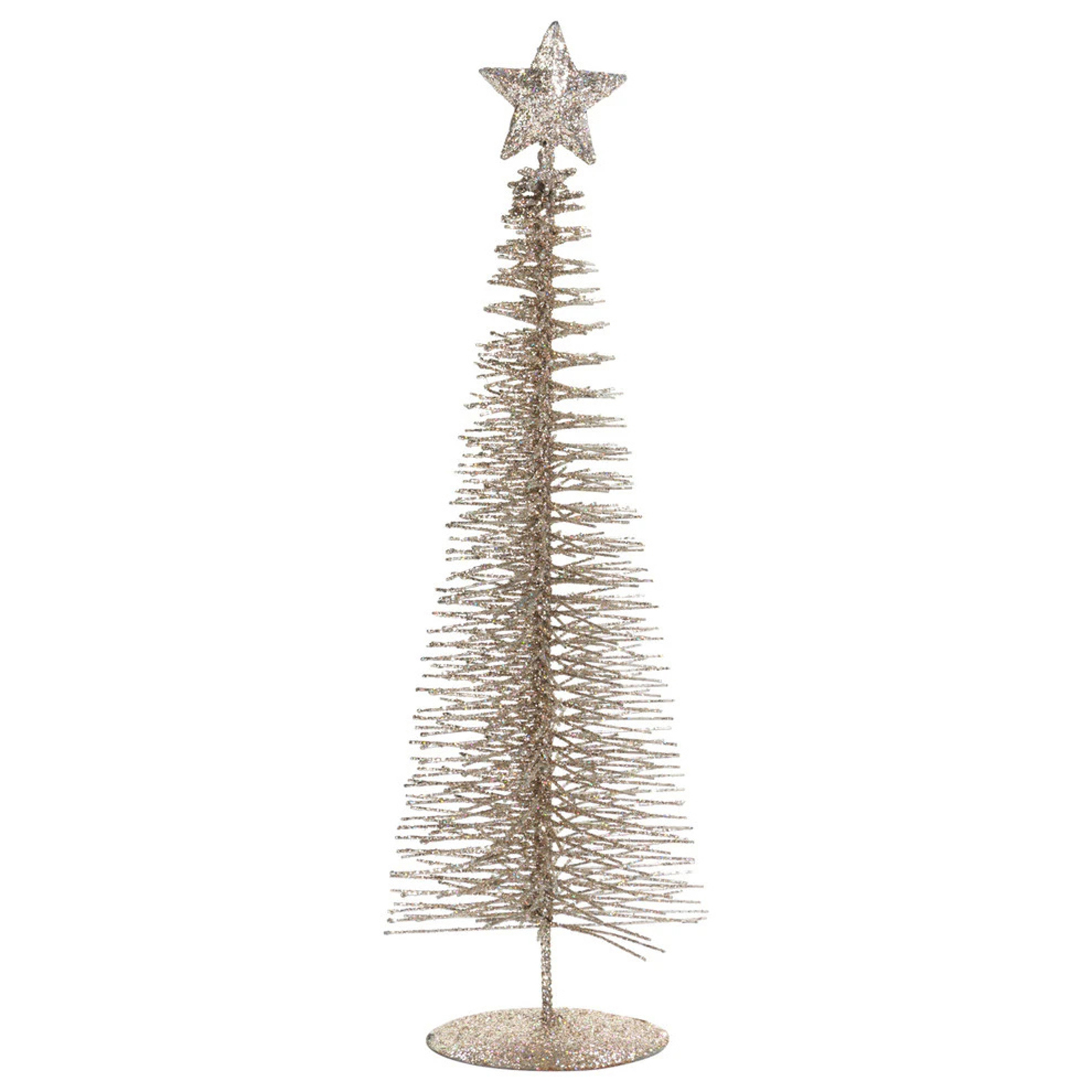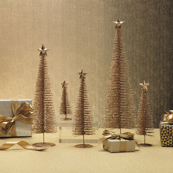 This simple and beautiful wire tree sculpture is a beautiful addition to any space. They add a sense of winter to a room and a simple balance. Features champagne color glitter drenched trees that are accented with star tree toppers.
