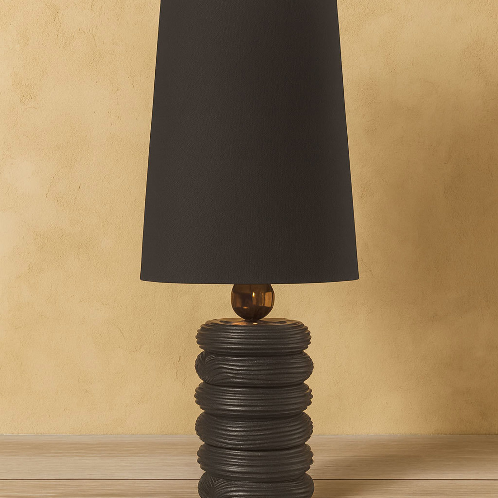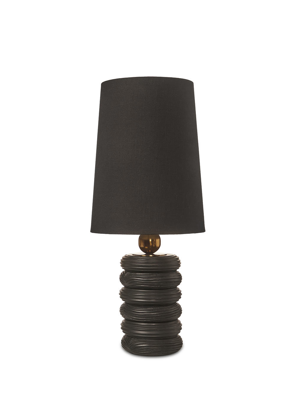 Richly contrasted in tone and texture, this lamp combines matte black wood with luxe gold accents. It radiates understated sophistication — a striking accent that elevates any bedside or console with warmth and dimension.