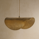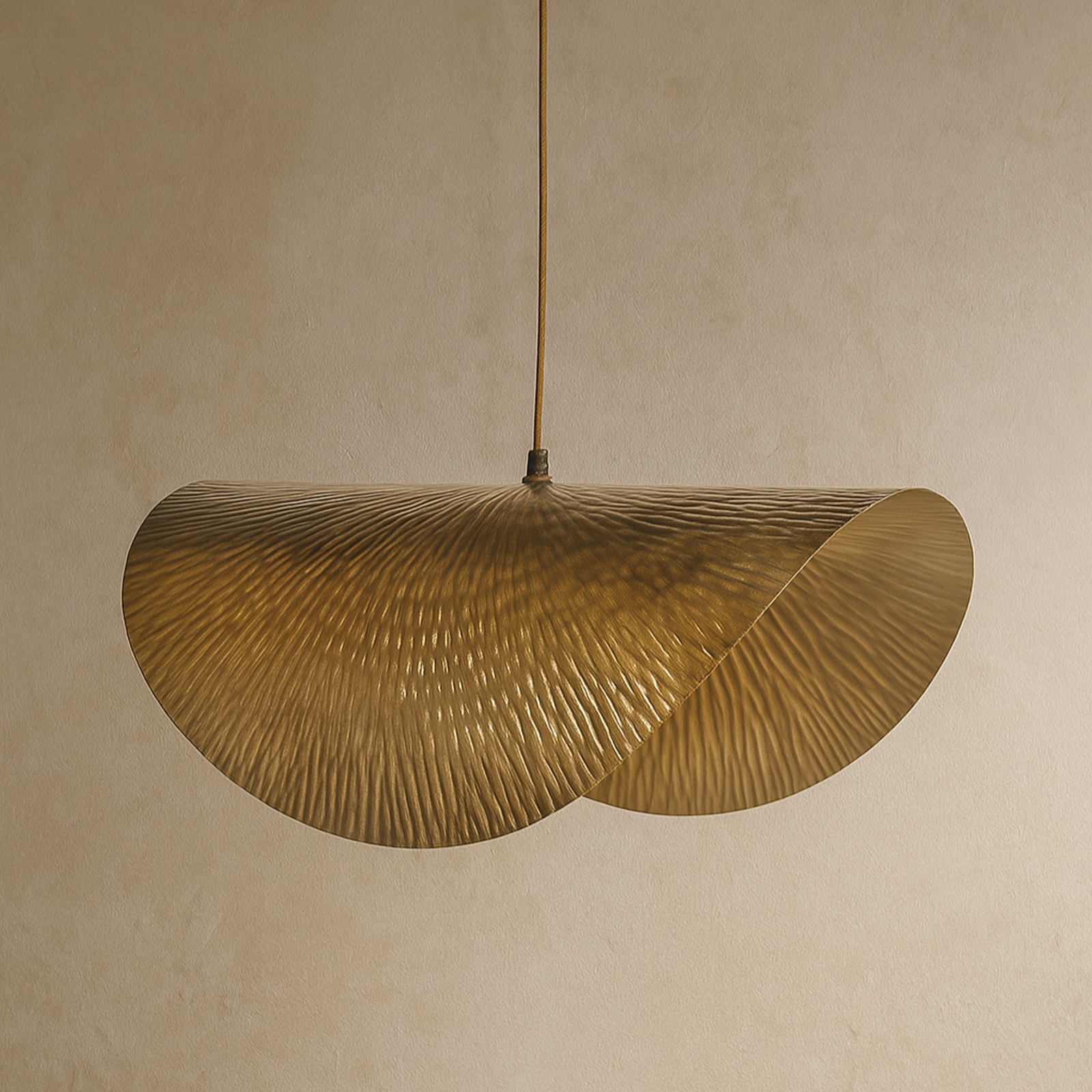 This pendant’s hand-hammered metal finish captures artisanal craftsmanship in a sleek, modern form. The warm metallic tones and gently curved shape cast a soft, diffused light — ideal for kitchens, dining areas, or entryways.