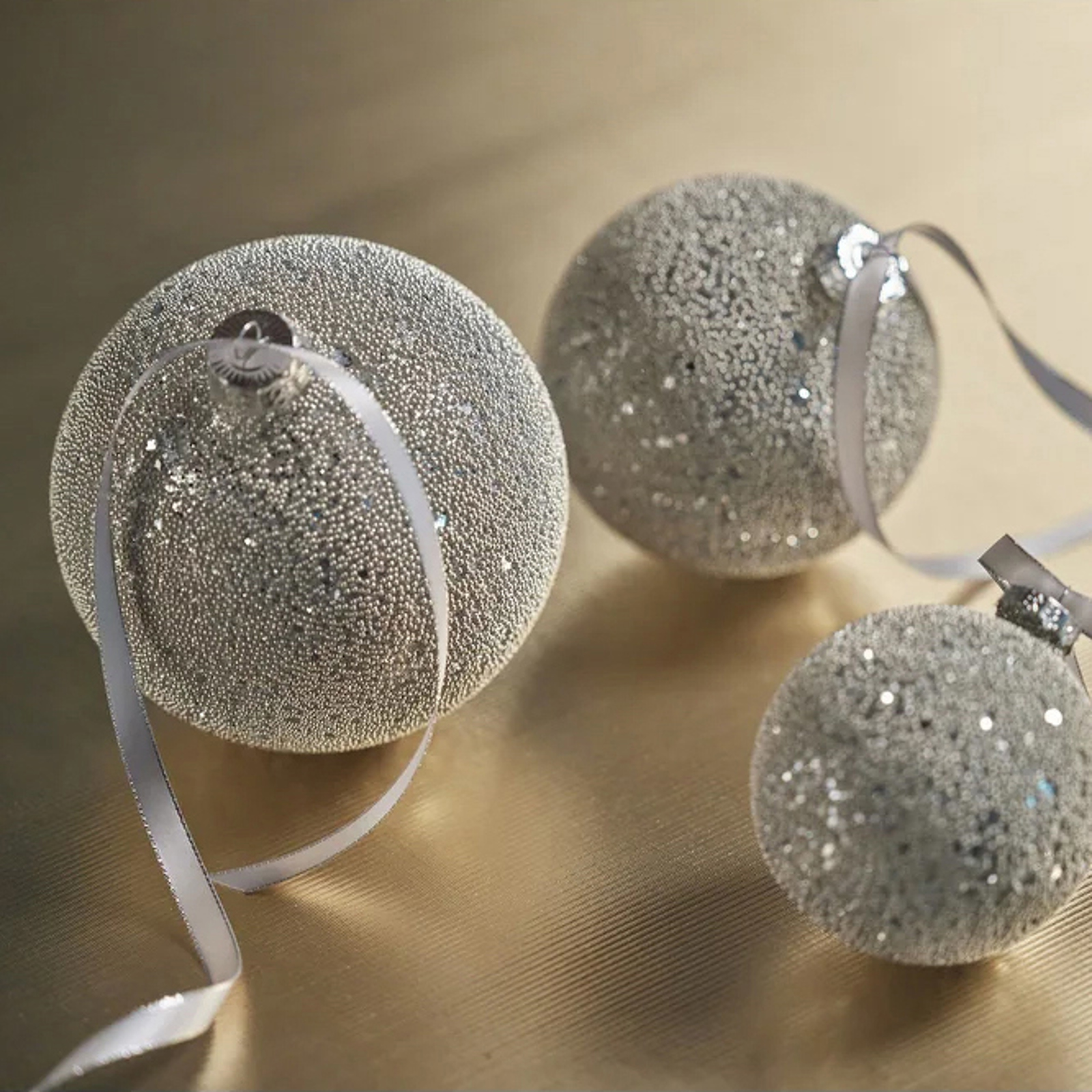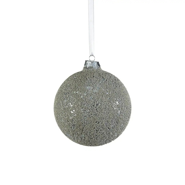 A touch of glamour is just what your tree needs to make your holiday truly shine. These classic ball ornaments are covered in sparkling beads. Full of reflective light & texture, this glass ornament is a treasure for the tree. A beautiful way to add an upscale, formal touch.