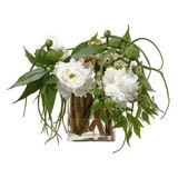 Our peony arrangement brings the lush beauty of spring to your home all year long. Measuring 19 inches high and 21 inches wide, it features high-quality silk blooms arranged in a clear decorative glass vase for a fresh, lifelike look. With its soft petals and vibrant tones, this piece adds effortless charm and natural elegance to any space - no watering required.