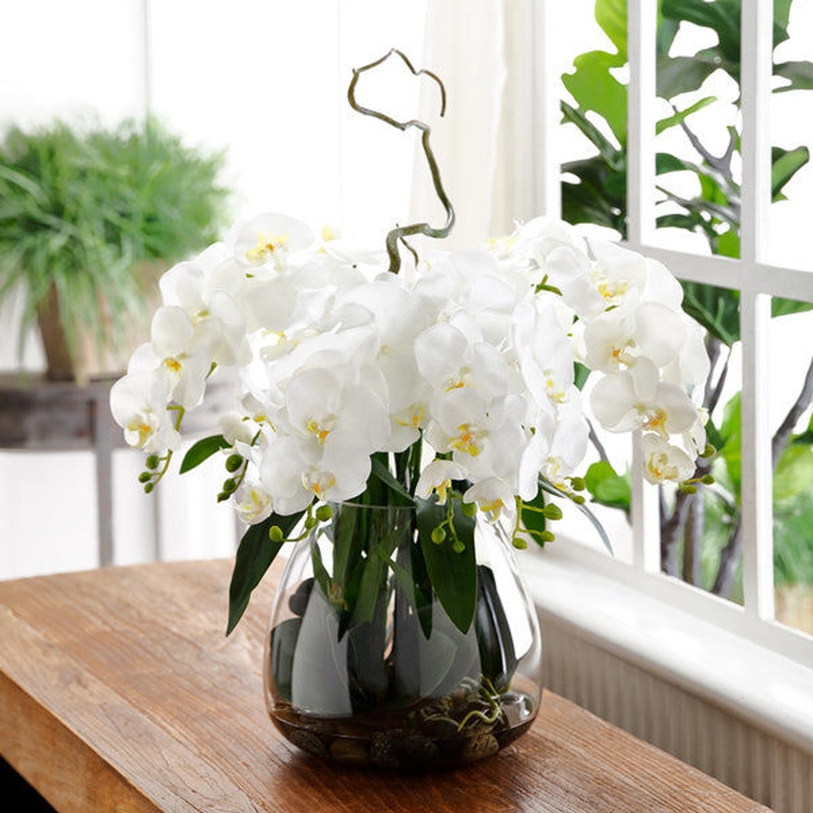 Our phalaenopsis orchid arrangement makes a striking statement with its graceful form and lifelike beauty. Crafted from high-quality silk, each bloom mirrors the delicate elegance of real orchids—without the need for care or upkeep. Designed to stand beautifully on its own, this arrangement brings a touch of sophistication and lasting serenity to any room.