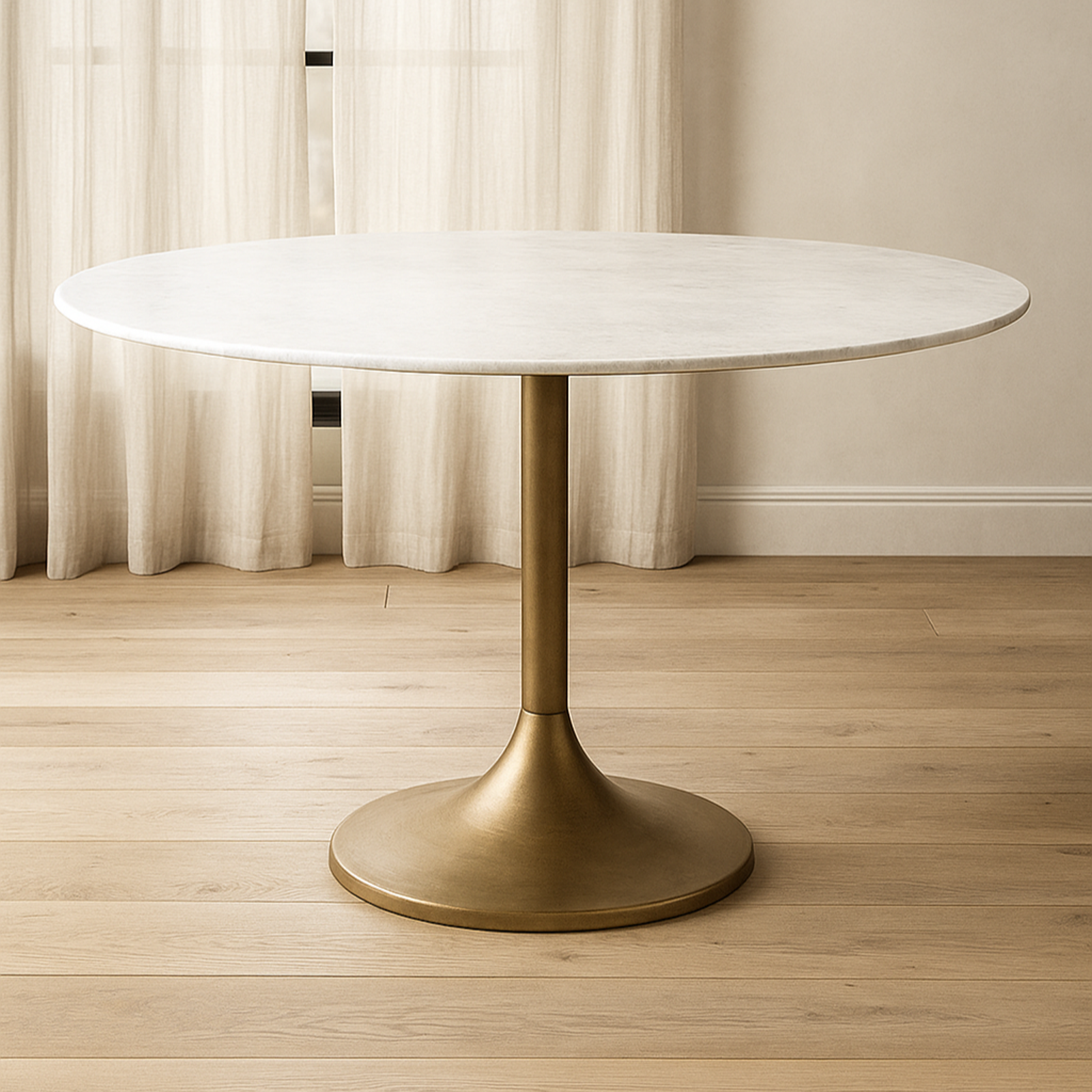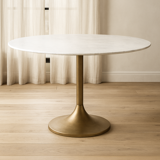 With its striking silhouette and refined material pairing, the Round Marble Top Dining Table on Metal Pedestal brings sculptural elegance to any dining space. The smooth, circular marble top introduces a sense of luxury and natural depth, beautifully balanced by the organic curves of the tapered metal pedestal. Its bold yet graceful profile creates a focal point that feels both modern and timeless, inviting effortless gatherings and everyday dining alike. Crafted for stability, style, and enduring appeal, this piece anchors your room with sophistication and artistic presence.