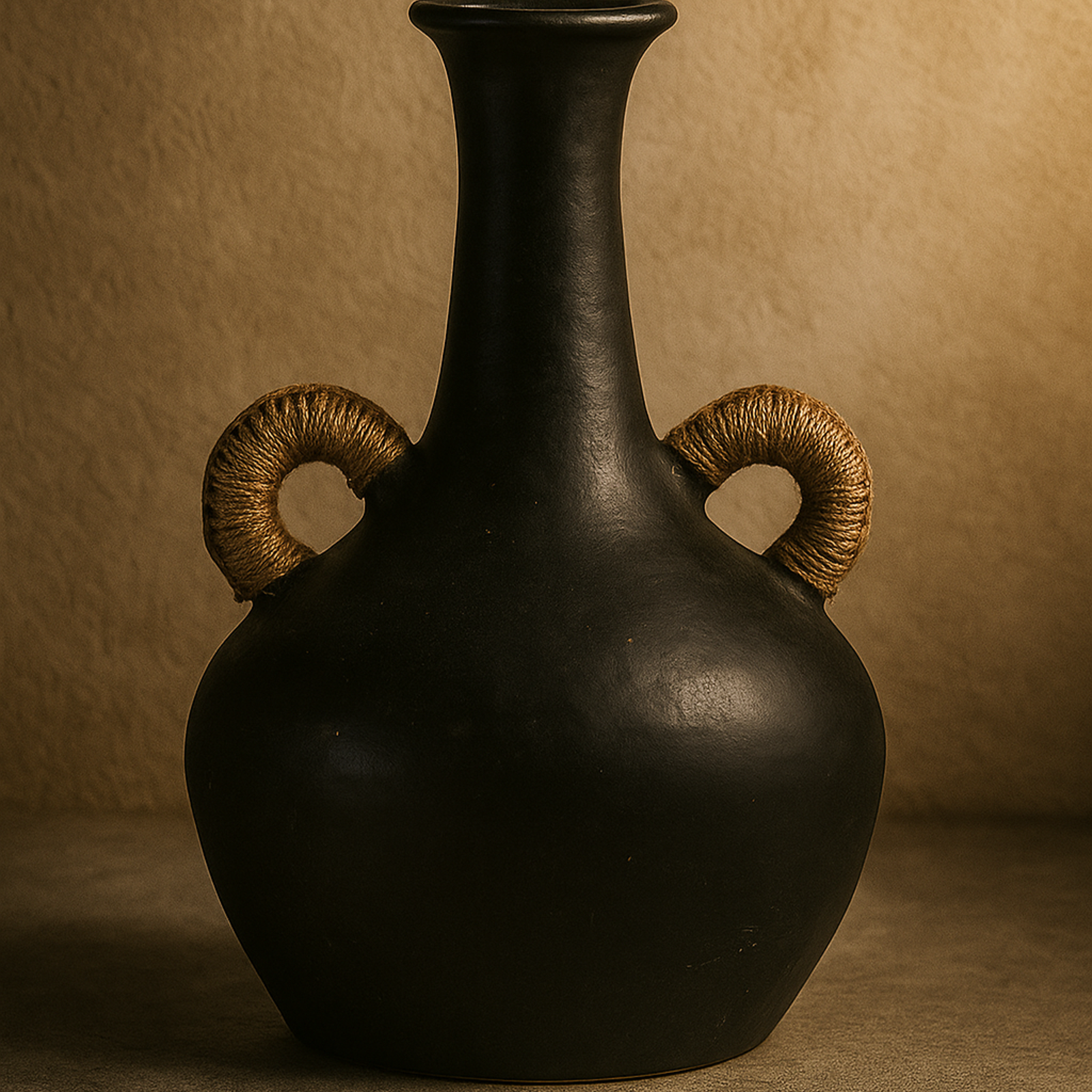 Traditional form meets modern texture in this handcrafted clay vase. Wrapped jute handles add a touch of rustic charm to the smooth black body — a perfect mix of natural and contemporary design.